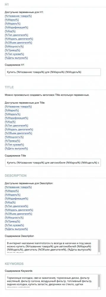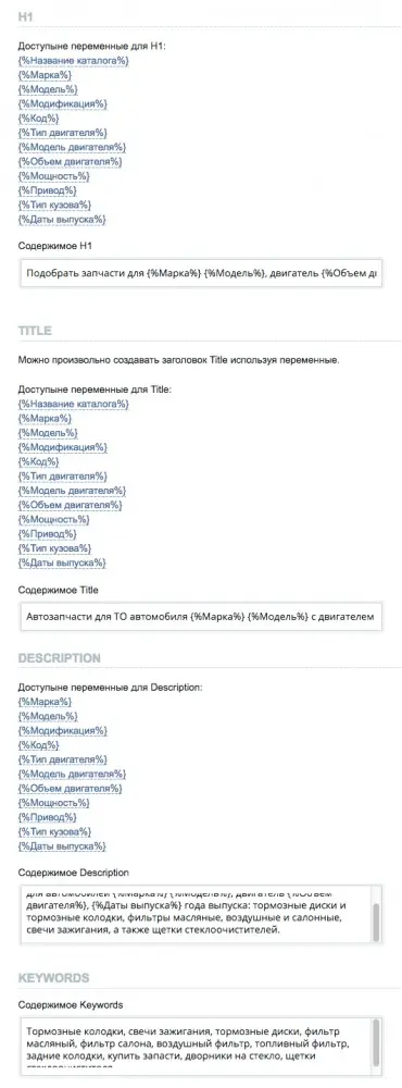 Заголовок H1 «Каталог запчастей для ТО «прописываем самостоятельно, а переменная, обозначенная знаком {%Марка%}, будет подставлять значение той марки автомобиля, в категорию которой зашел клиент или поисковик при индексации.